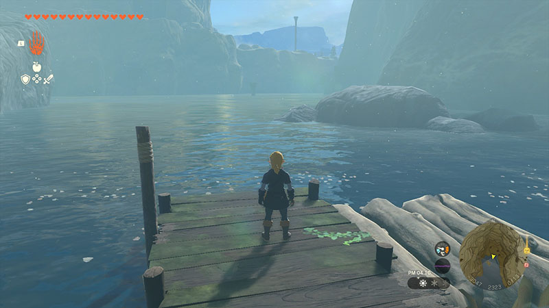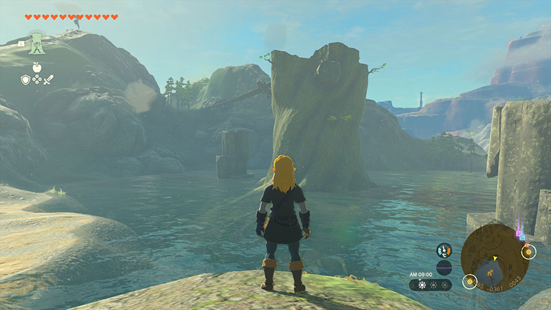 ハイラル城下町から南西に進むと見えてくるダフネス山。そのすぐ北にある湖の中央には千年樹と呼ばれる大樹がありました。今となっては枝のすべてが朽ち果てており、幹の一部分のみ残されています。