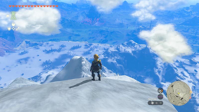 しかしそんなヘブラ山山頂の最大の魅力といえば、360度見渡せる大パノラマの風景で、まさにハイラル全土を一望できる絶景に他なりません。ヘブラ地方の大雪原はもちろん、緑豊かな中央ハイラル地方のハイラル城まで遠くに見えてきます。