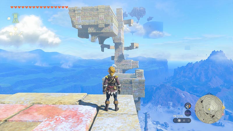 そんな空島ははるか上空に存在するため、翼を持つリト族でもなければたどり着けず、未だに多くの謎に包まれています。しかしヘブラ山山頂はその標高の高さから空島に近く、山頂から北東を向けば、そこには複数の遺跡が宙に浮かぶ、何とも奇妙な光景が広がっています。